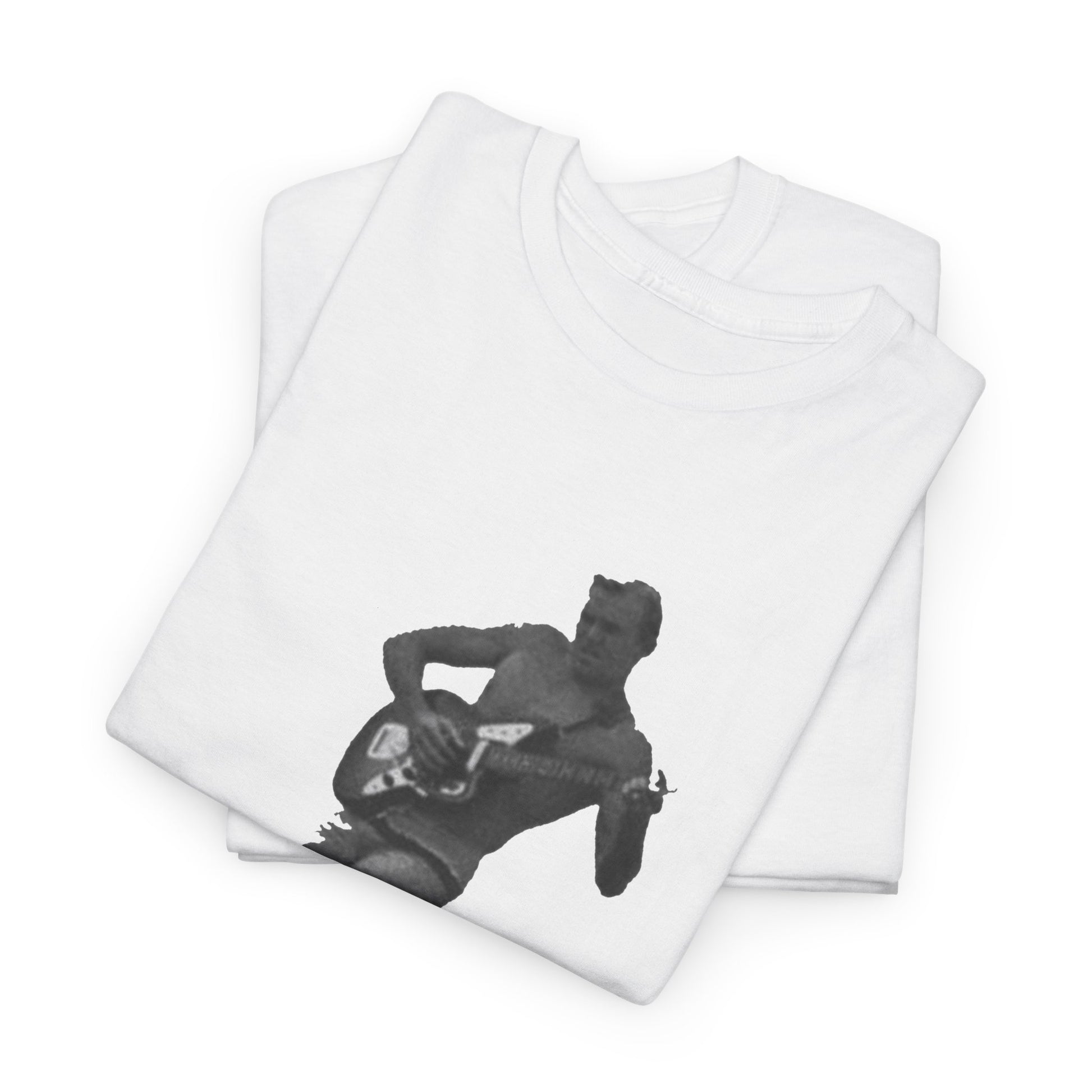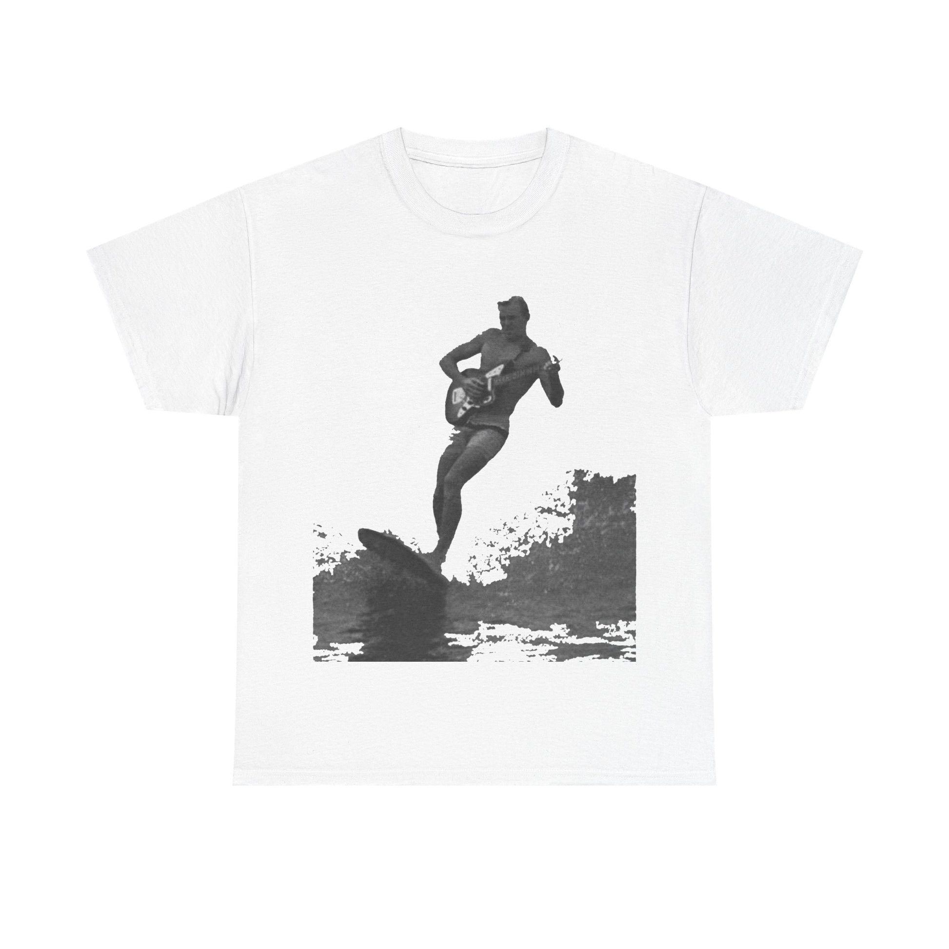 A unisex heavy cotton T-shirt featuring a design of a dude surfing and playing his Fender Guitar at the same time, giving off a vibe of the best of both worlds from the 60s. This T-shirt is perfect for music and surfing enthusiasts looking to add a touch of retro coolness to their wardrobe. Ideal for casual wear, beach outings, music festivals, and summer parties.