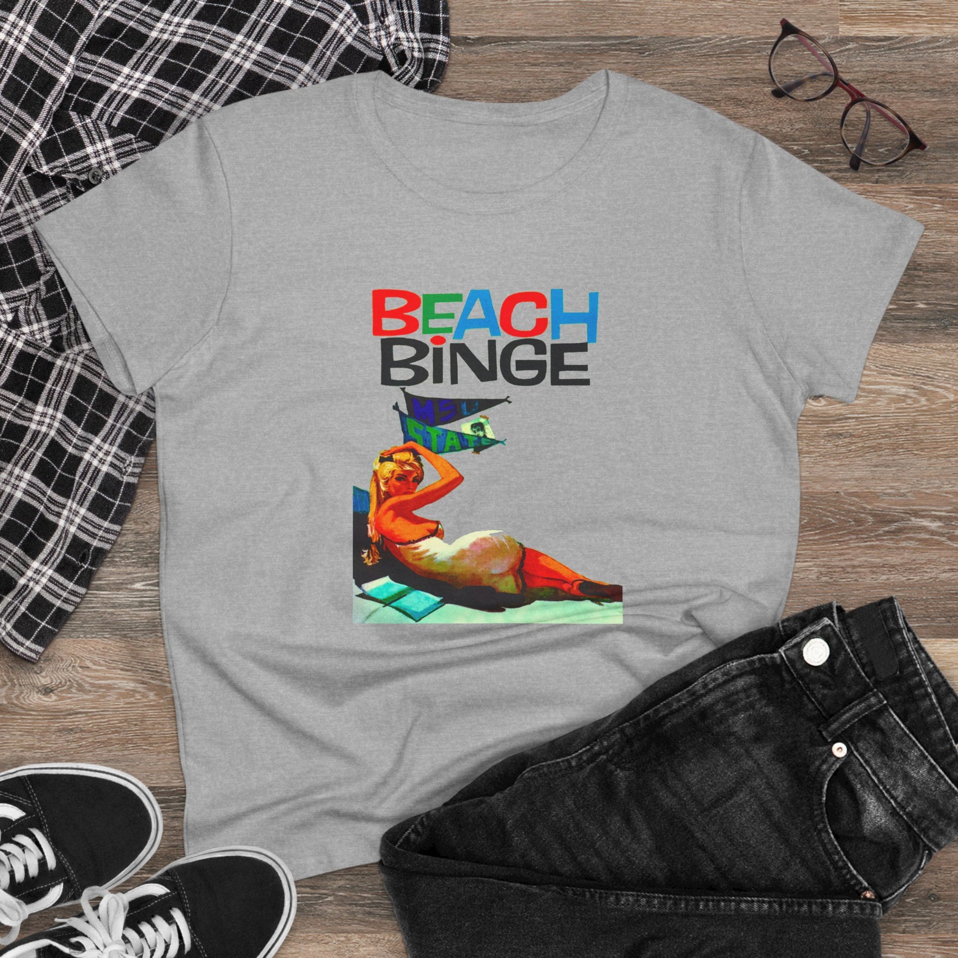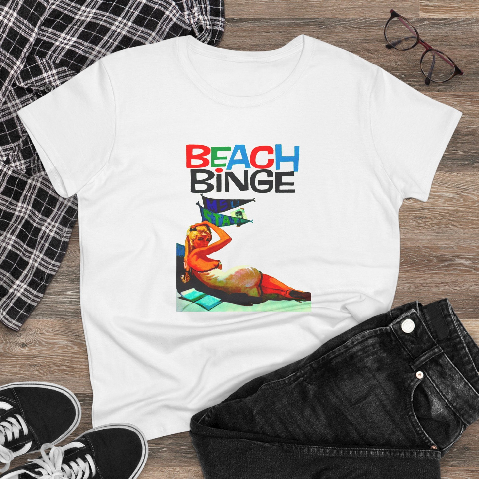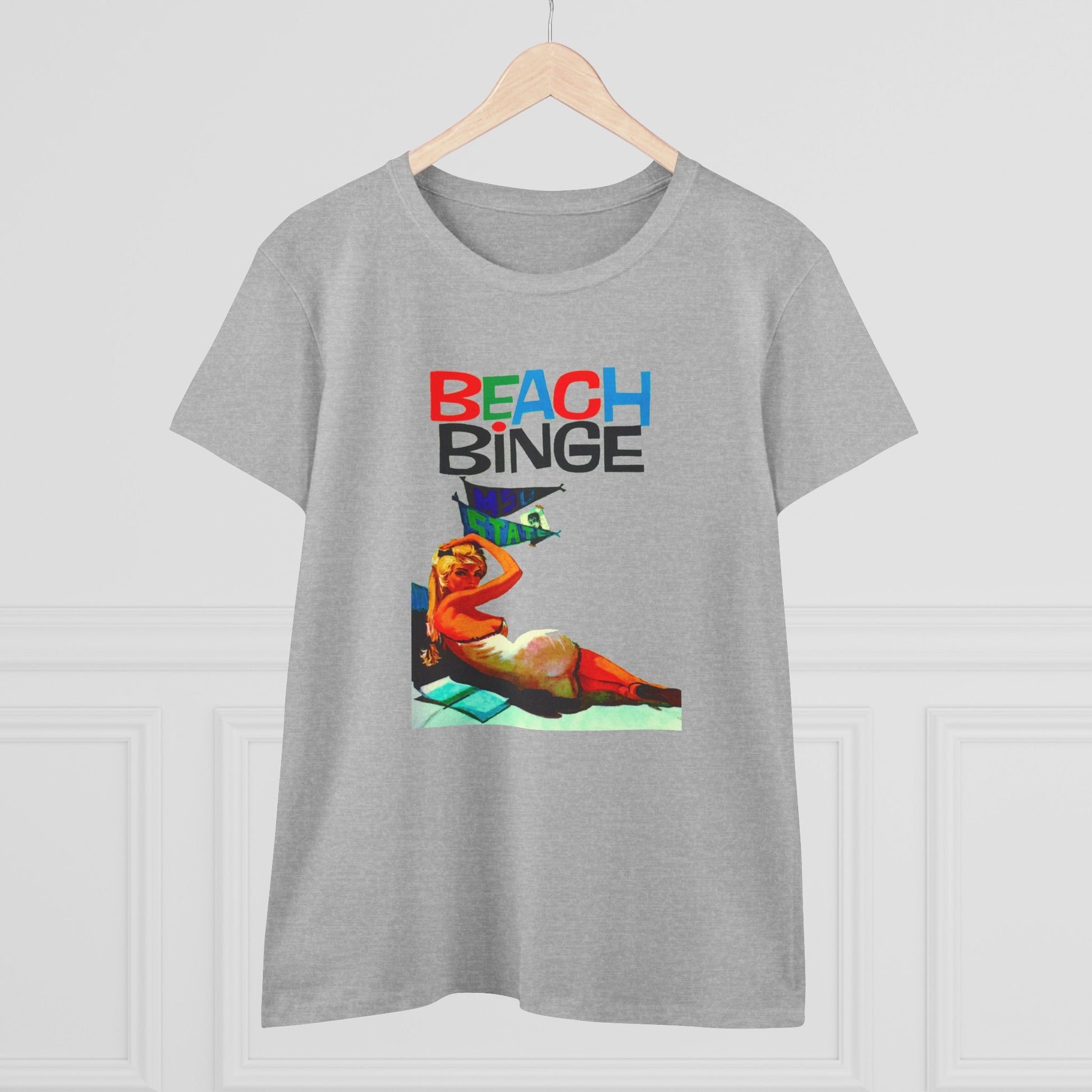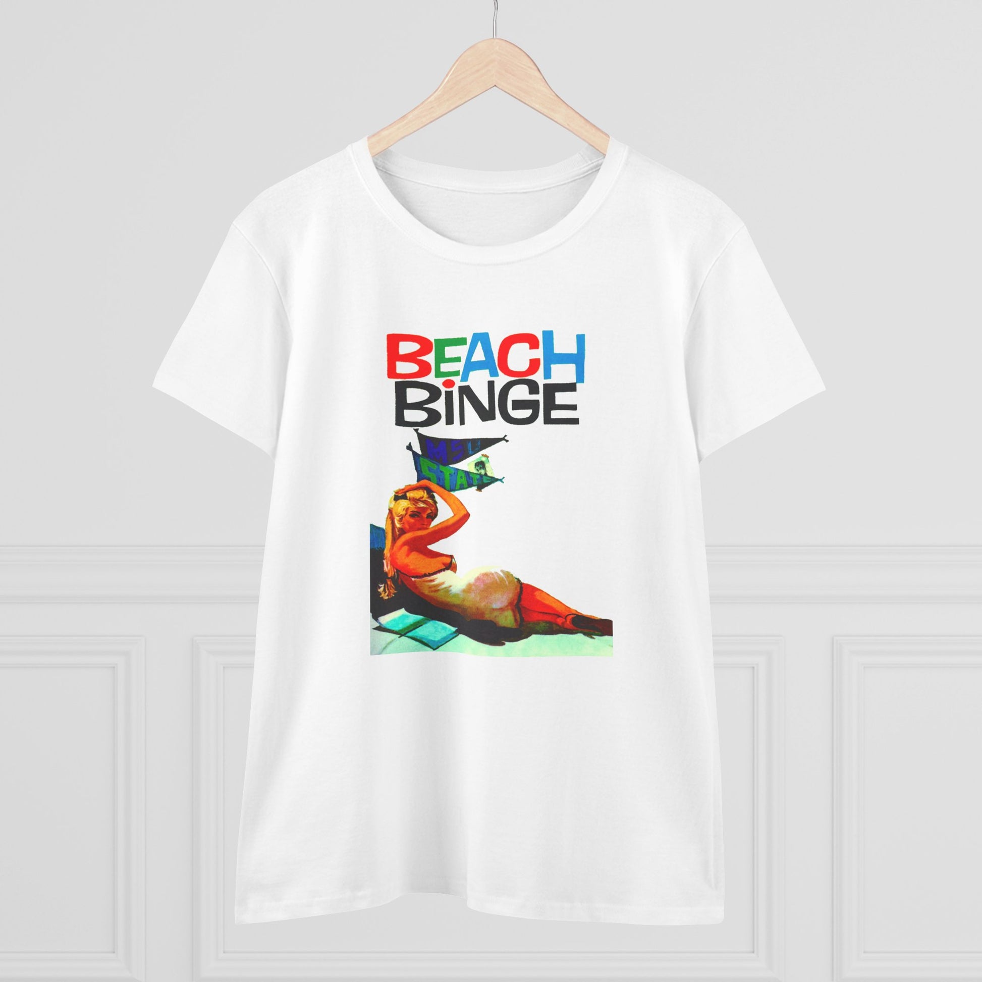 Stay stylish at the beach with this Beach Binge Tee featuring a blonde getting ready for a retro wild beach party. Perfect for women who love the beach and enjoy fun summer festivities. Ideal for vacations, beach parties, summer celebrations, and casual outings.