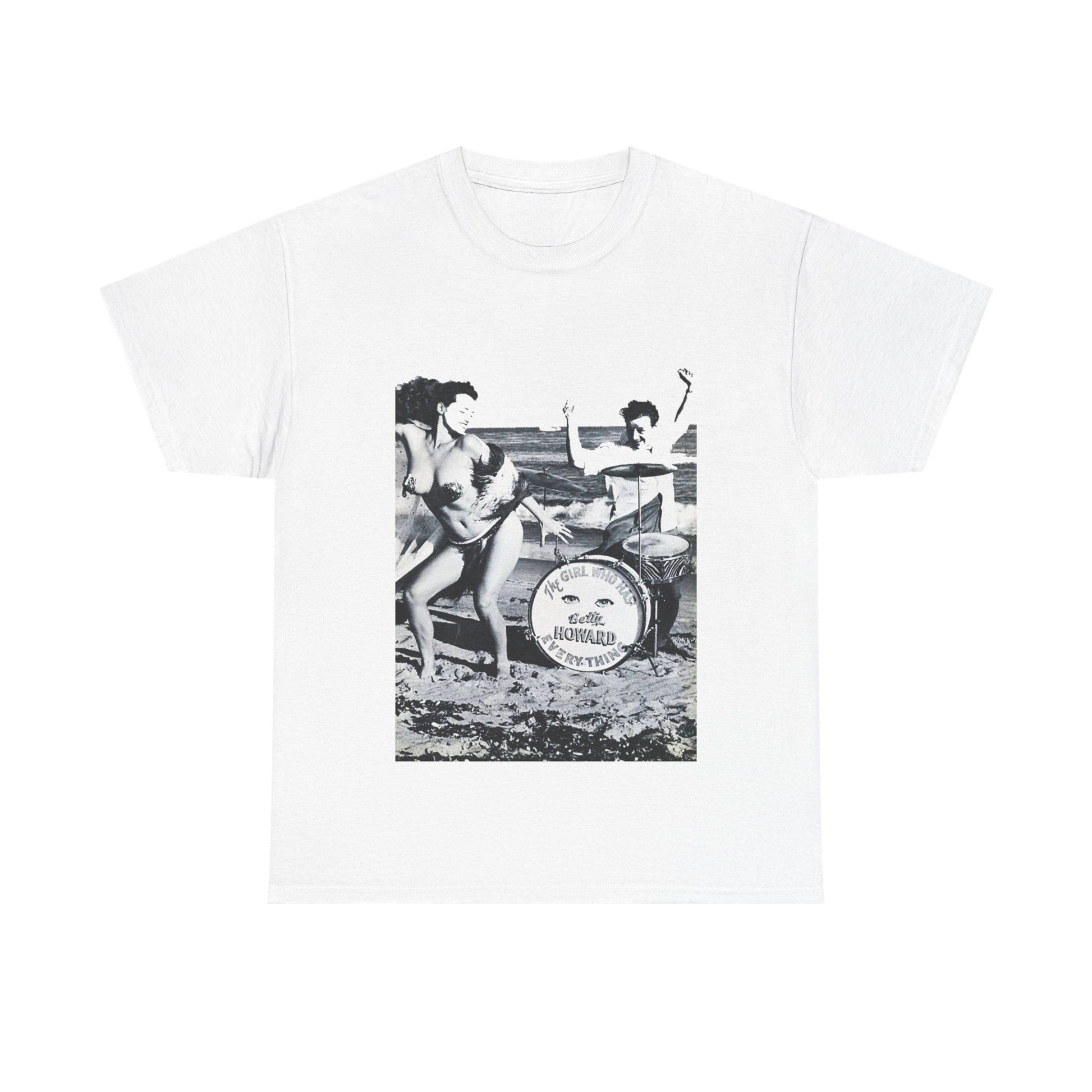 This Beach Burlesque T-shirt features a dancer and drummer design with waves and ocean elements, giving off a 60s vibe. Perfect for those who love retro styles and beach-themed apparel. This t-shirt is great for casual wear and can be worn to beach parties, music festivals, or summer vacations.