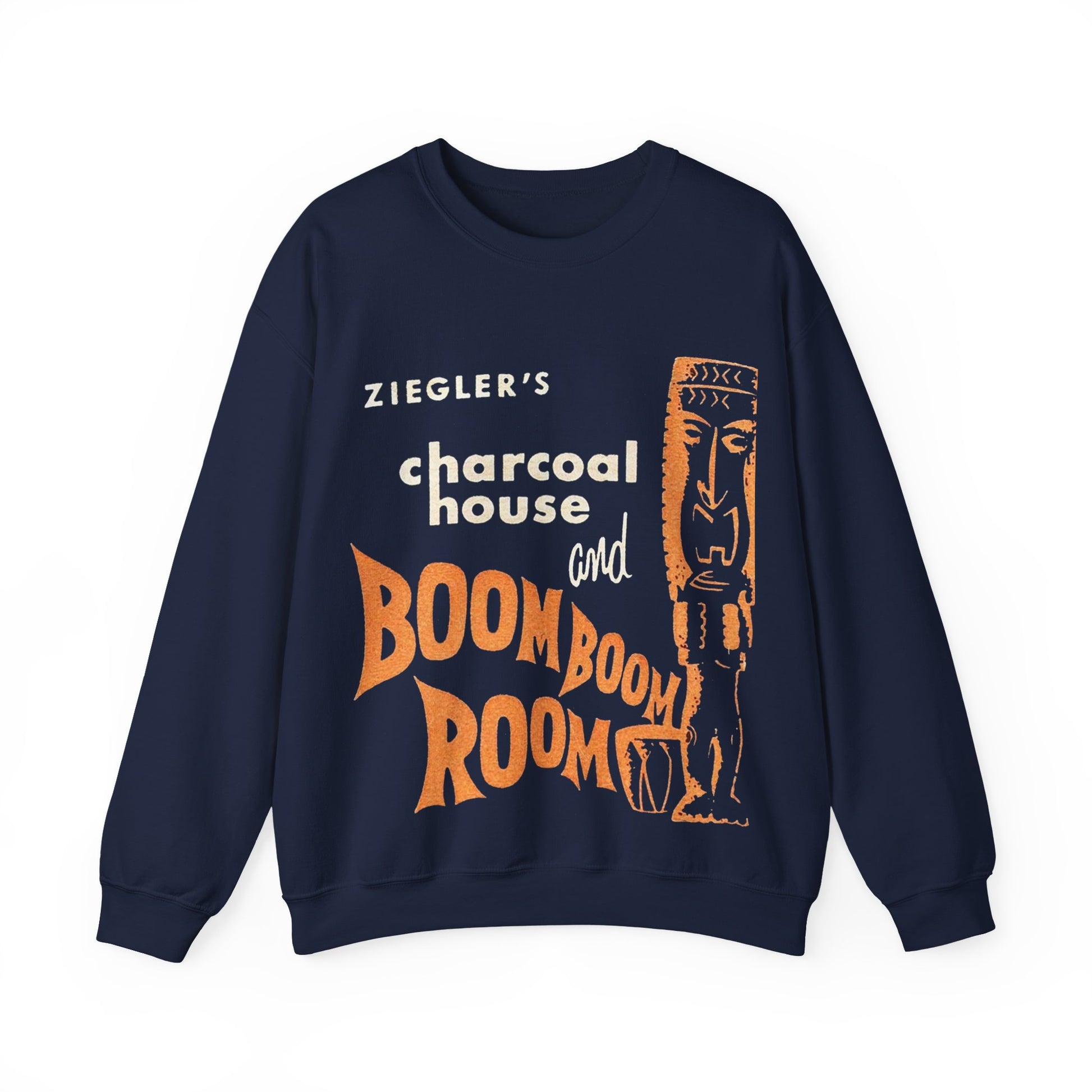 Vintage-inspired Boom Boom Room Sweatshirt with a repaired 60s matchbook cover featuring a cool tiki design. This cozy and stylish sweatshirt is perfect for those who love retro vibes and want to stand out from the crowd. Ideal for casual wear or as a statement piece during music festivals or beach parties. Relevant for those who enjoy nostalgic designs and unique fashion pieces, suitable for music festival attendees and beachgoers. Perfect for gift-giving on birthdays, holidays, or as a treat for oneself.