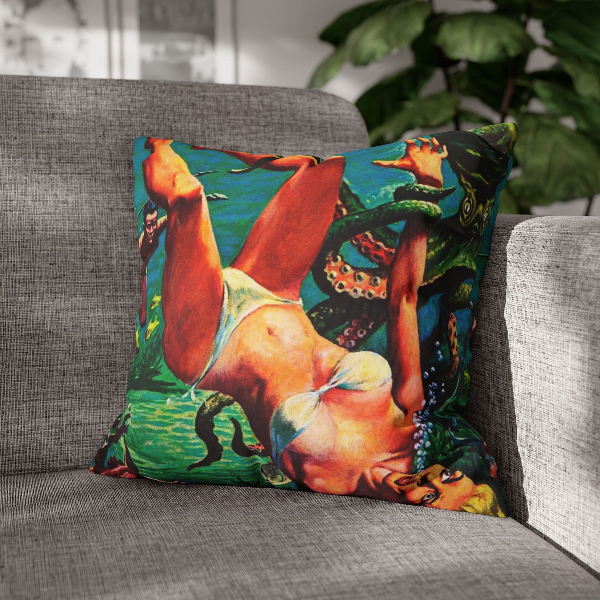 Vintage Island Diving Adventure Cushion Cover with a retro vibe. Blonde Bikini Clad diver being rescued from a Giant Octopus! Perfect for adding a pop of color and personality to your living space. Ideal for those who love vintage decor and tropical themes. Great for decorating during summer parties, luau events, and beach-themed gatherings.