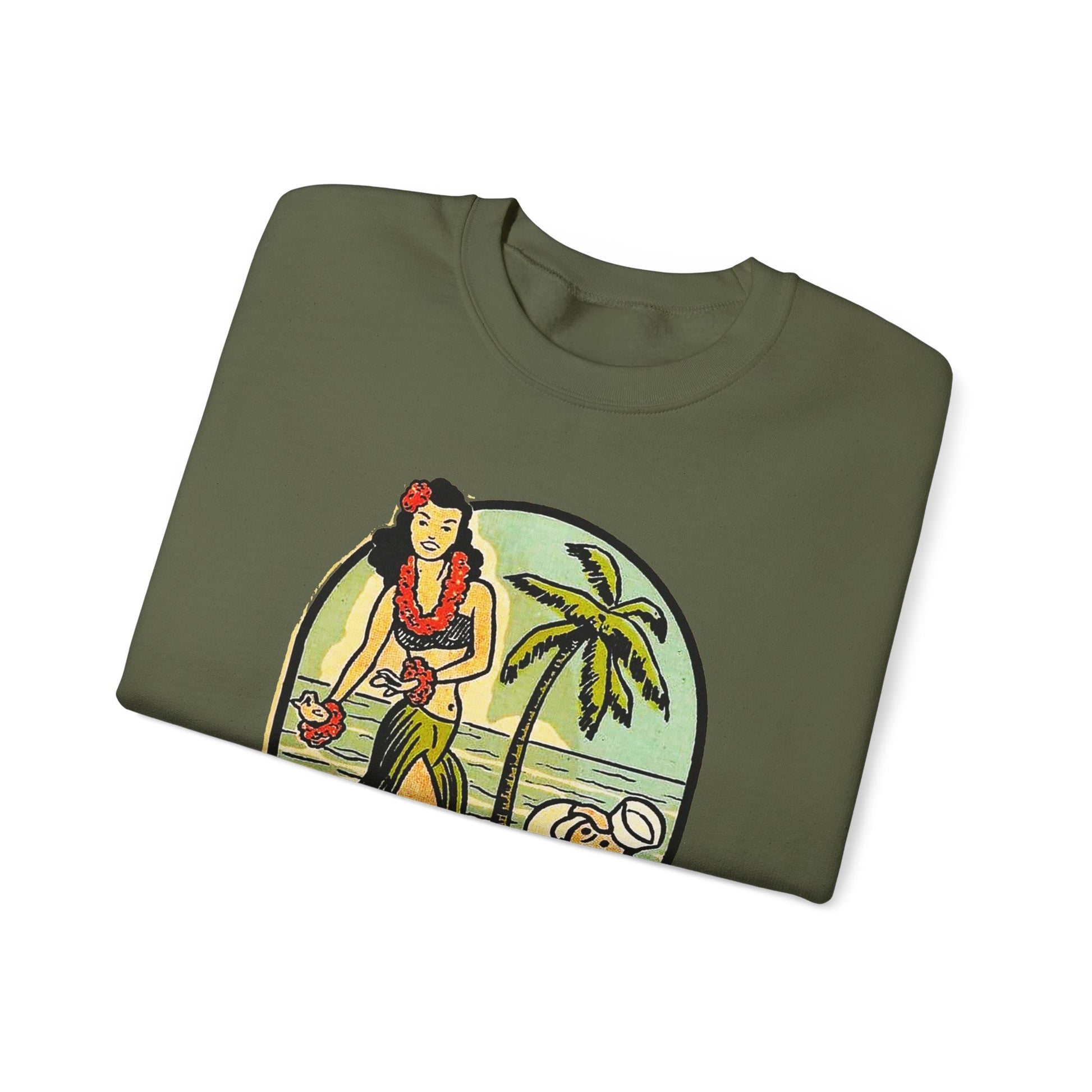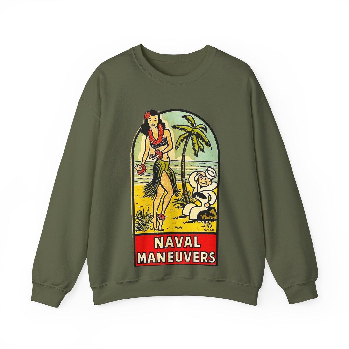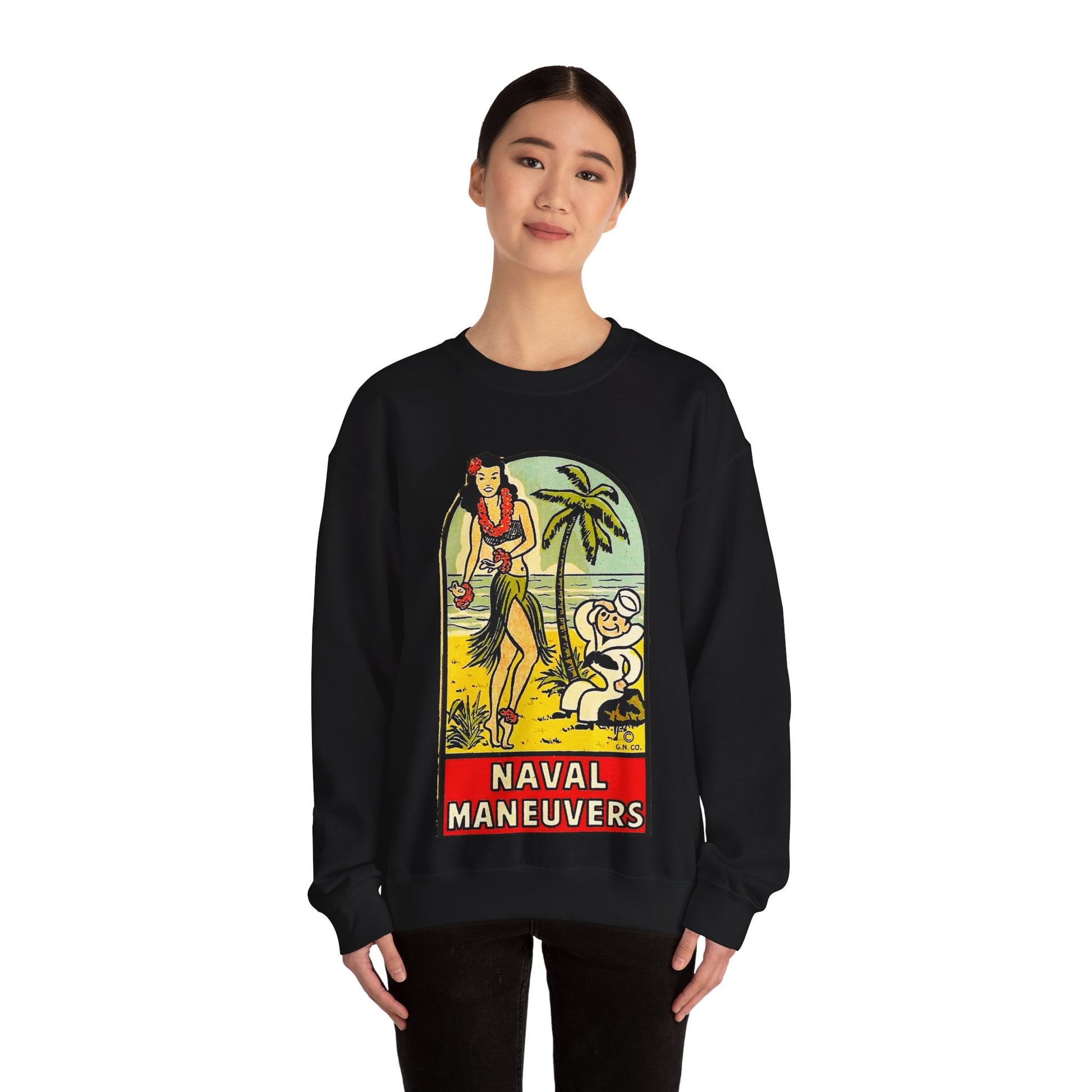 This retro Naval Maneuvers Sweatshirt features a shipwrecked sailor being wooed by a beautiful hula girl. It gives off a vintage, nautical vibe perfect for those who love unique and eye-catching designs. Ideal for anyone looking for a cozy and stylish hoodie to wear during casual outings or relaxing at home. Suitable for fans of retro and maritime themes, great for gifting during birthdays, holidays, and special occasions.