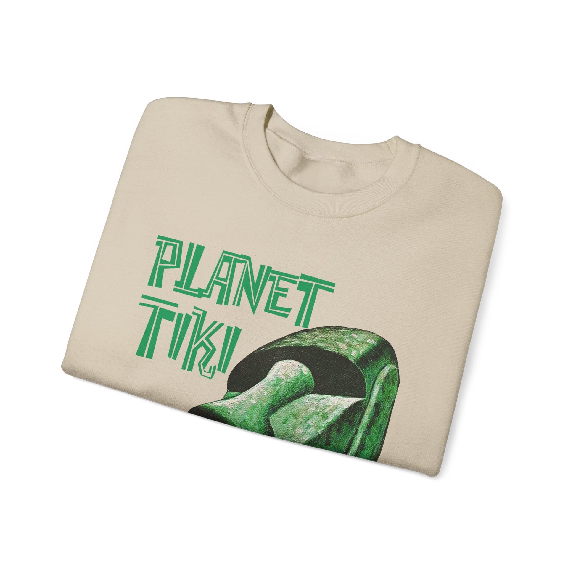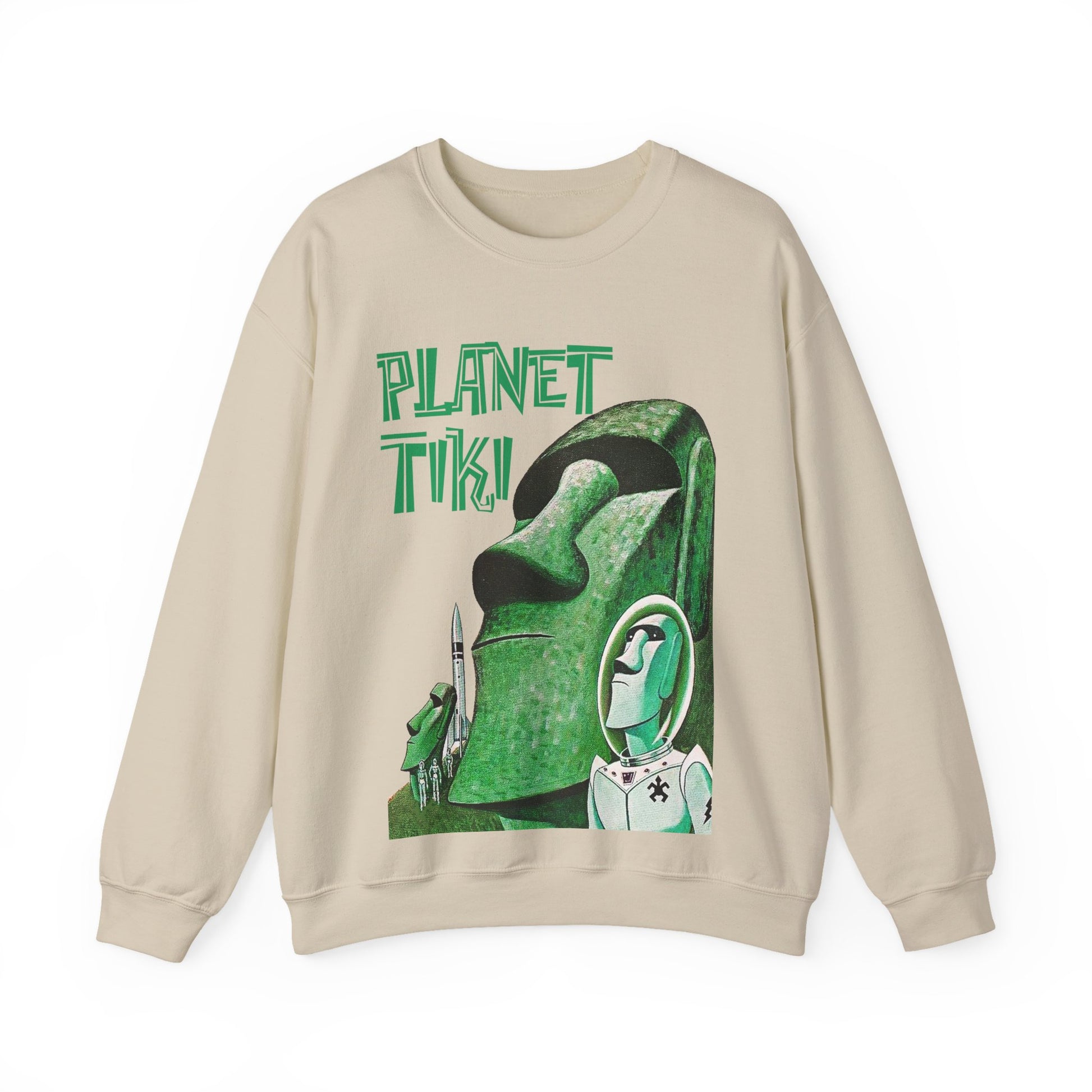 This Planet Tiki sweatshirt features space men, planets, UFOS, and a Moai from a 60s pulp cover, giving off a retro and fun vibe. Perfect for fans of sci-fi and vintage themes, this sweatshirt is great for casual wear or as a statement piece for special occasions and events. It is relevant for those who appreciate retro and sci-fi aesthetics, and is ideal for occasions like themed parties, casual outings, and fan gatherings.