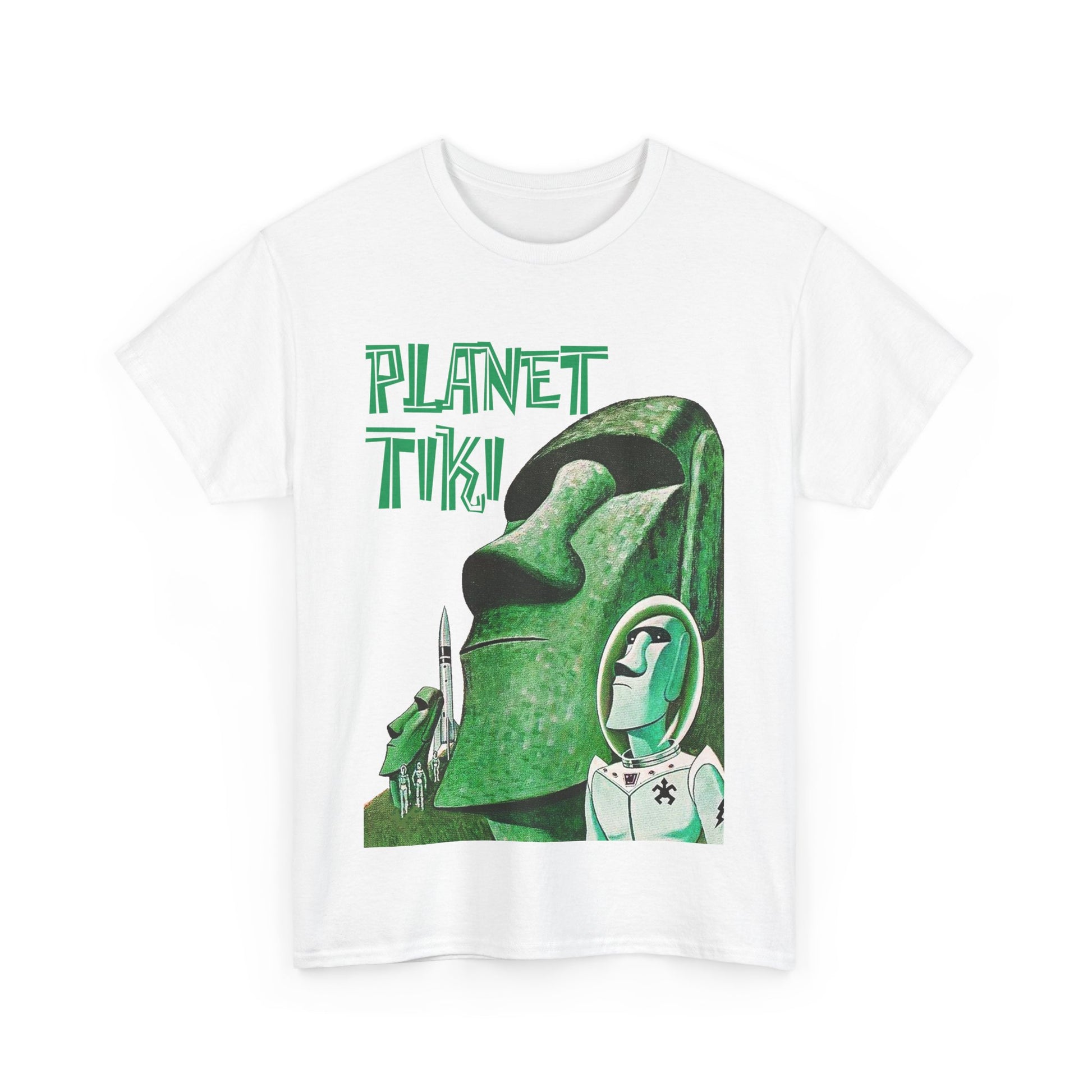 This Planet Tiki T-Shirt features space men, planets, UFOS, and a Moai from a 60s pulp cover, giving off a retro and fun vibe. Perfect for fans of sci-fi and vintage themes, this t-shirt is great for casual wear or as a statement piece for special occasions and events.