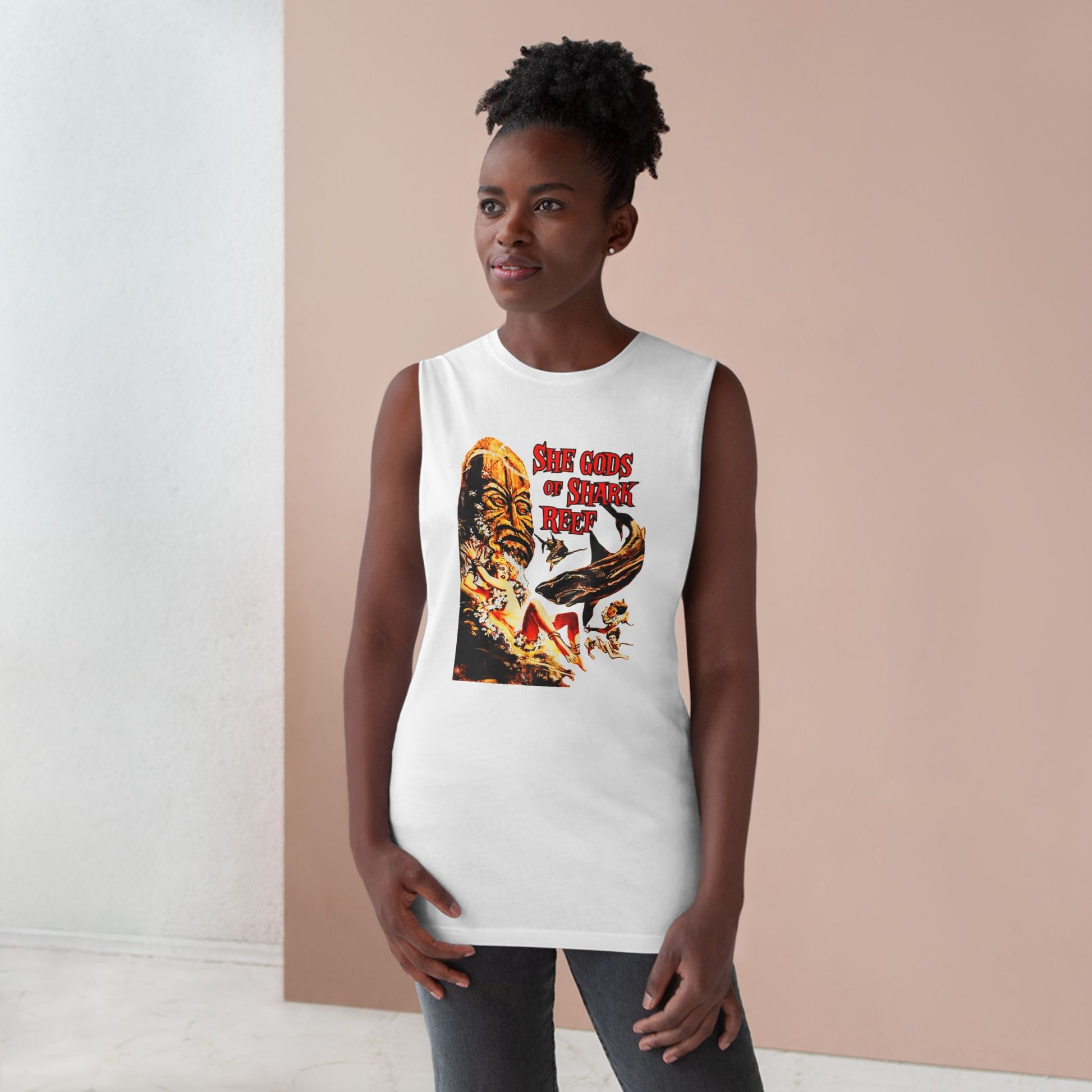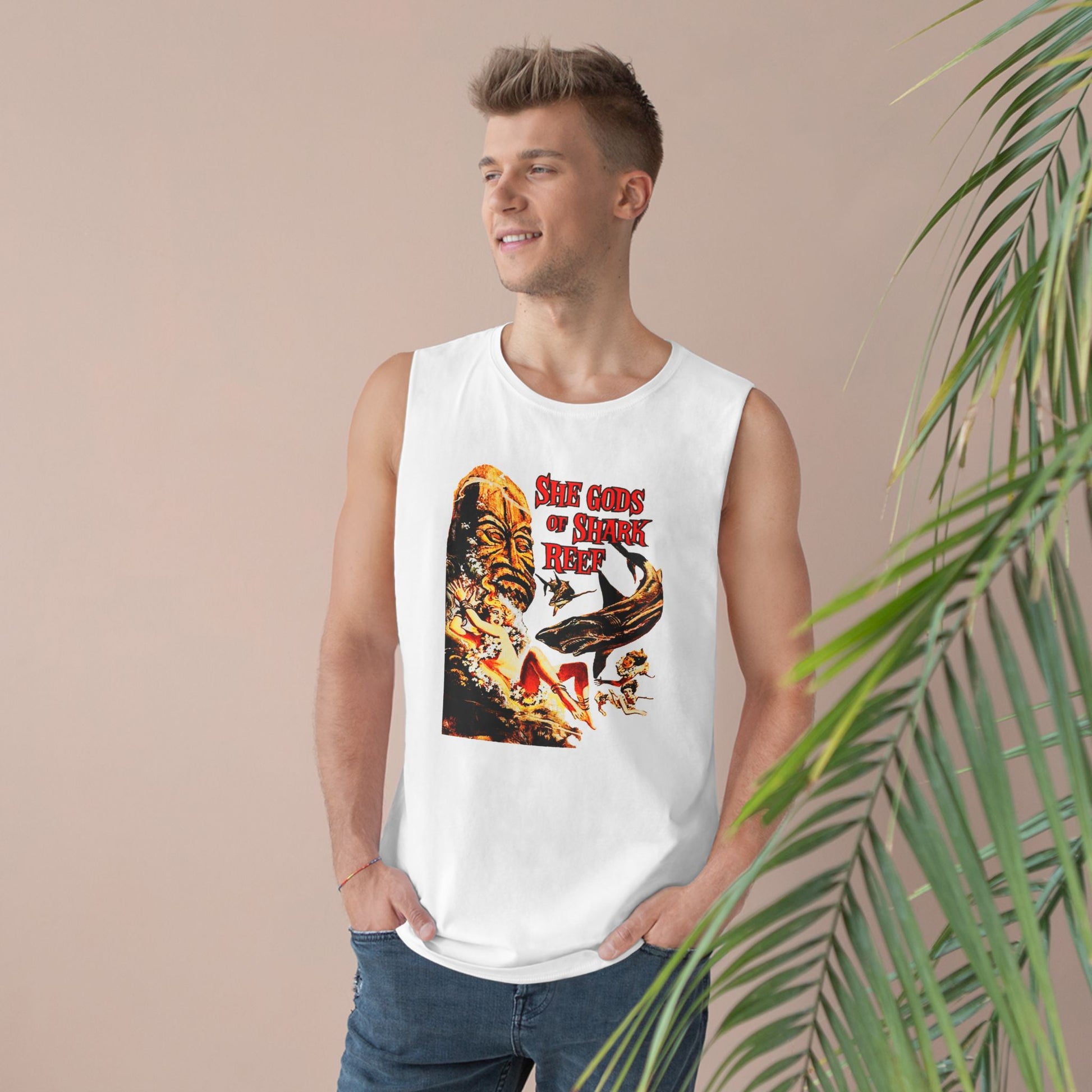 This She Gods Of Shark Reef Tank features a retro Cult Film design of a female escaping a shark attack while being guarded by a tiki god. This singlet exudes a vintage and adventurous vibe, perfect for fans of classic movies and retro style. It can be a great conversation starter and a unique addition to any wardrobe. Ideal for movie buffs, retro enthusiasts, and those who appreciate quirky, eye-catching designs. Suitable for movie nights, film festivals, theme parties, and casual outings