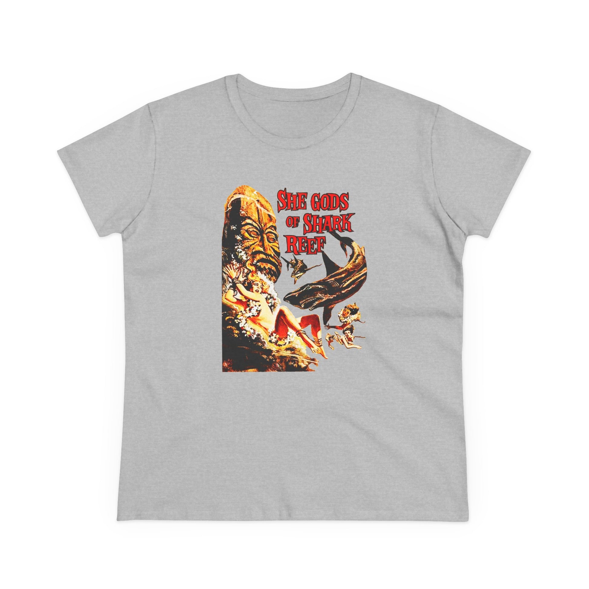 This She Gods Of Shark Reef T-shirt features a retro Cult Film design of a female escaping a shark attack while being guarded by a tiki god. The shirt exudes a vintage and adventurous vibe, perfect for fans of classic movies and retro style. It can be a great conversation starter and a unique addition to any wardrobe. Ideal for movie buffs, retro enthusiasts, and those who appreciate quirky, eye-catching designs. Suitable for movie nights, film festivals, theme parties, and casual outings.