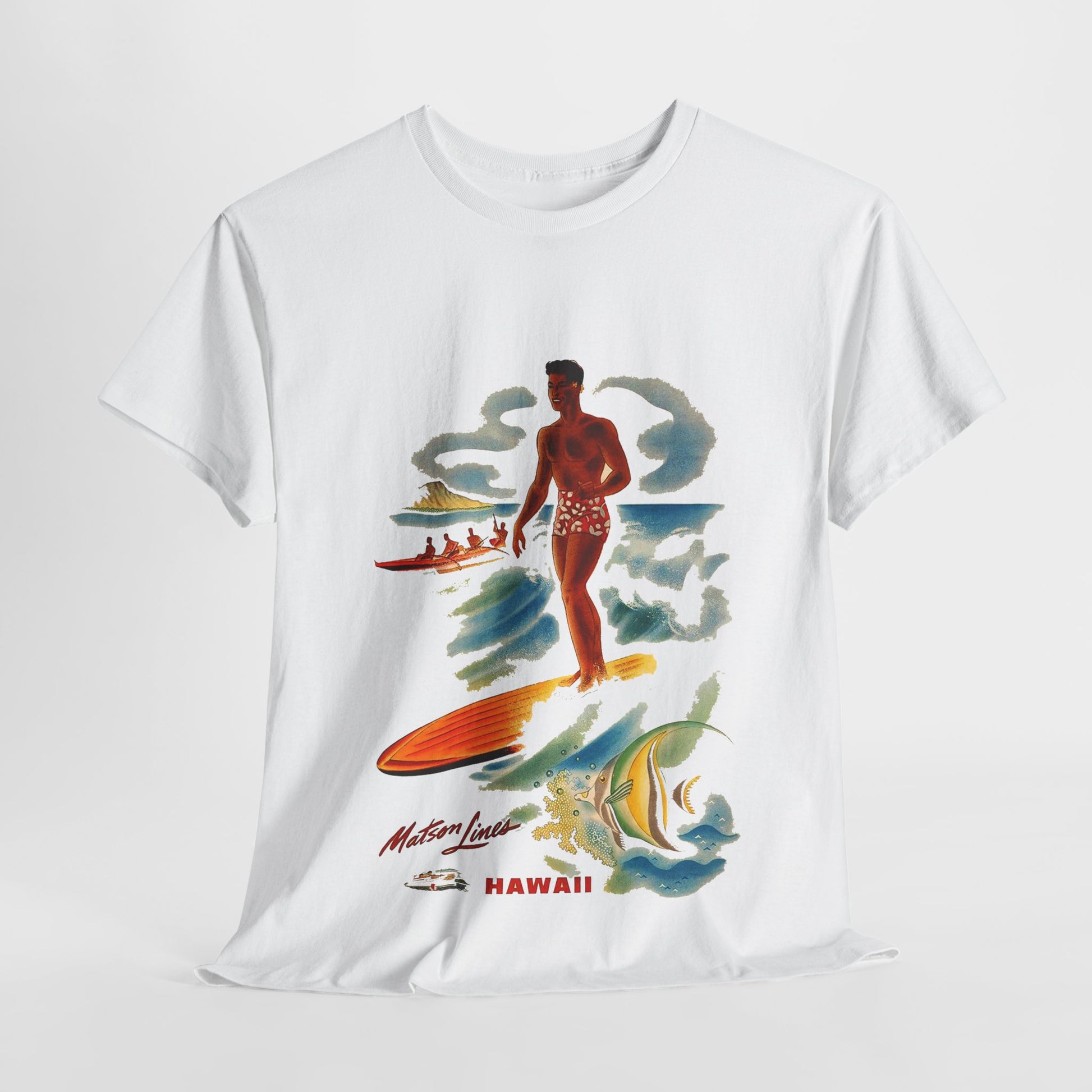 Retro Vintage Hawaiian Surfer T-shirt, perfect for those who love the beach and surfing vibes. Great for casual wear or as a travel advertisement. Ideal for beachgoers, surfers, and those who appreciate vintage designs. Relevant for summer, beach vacations, and Hawaiian-themed events.