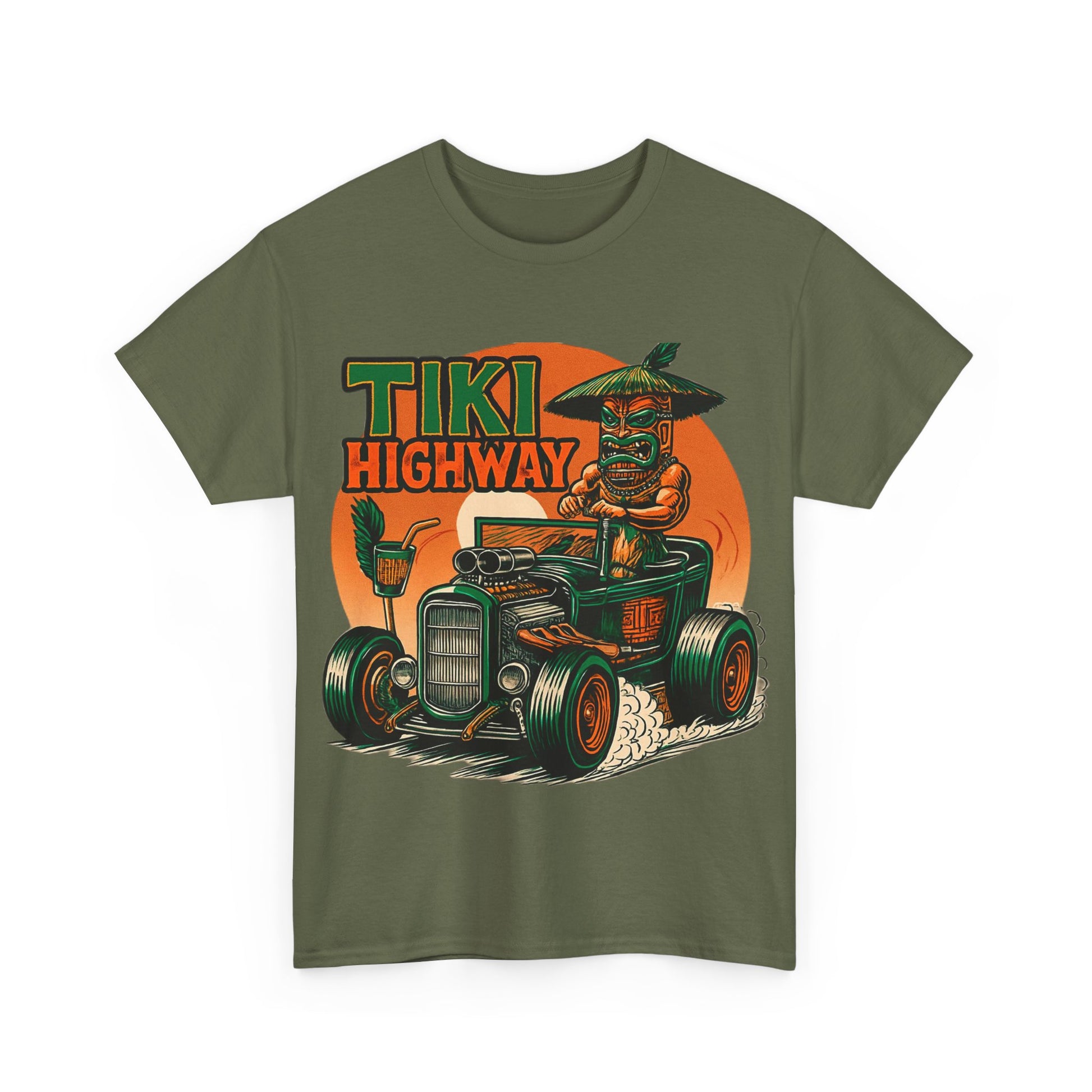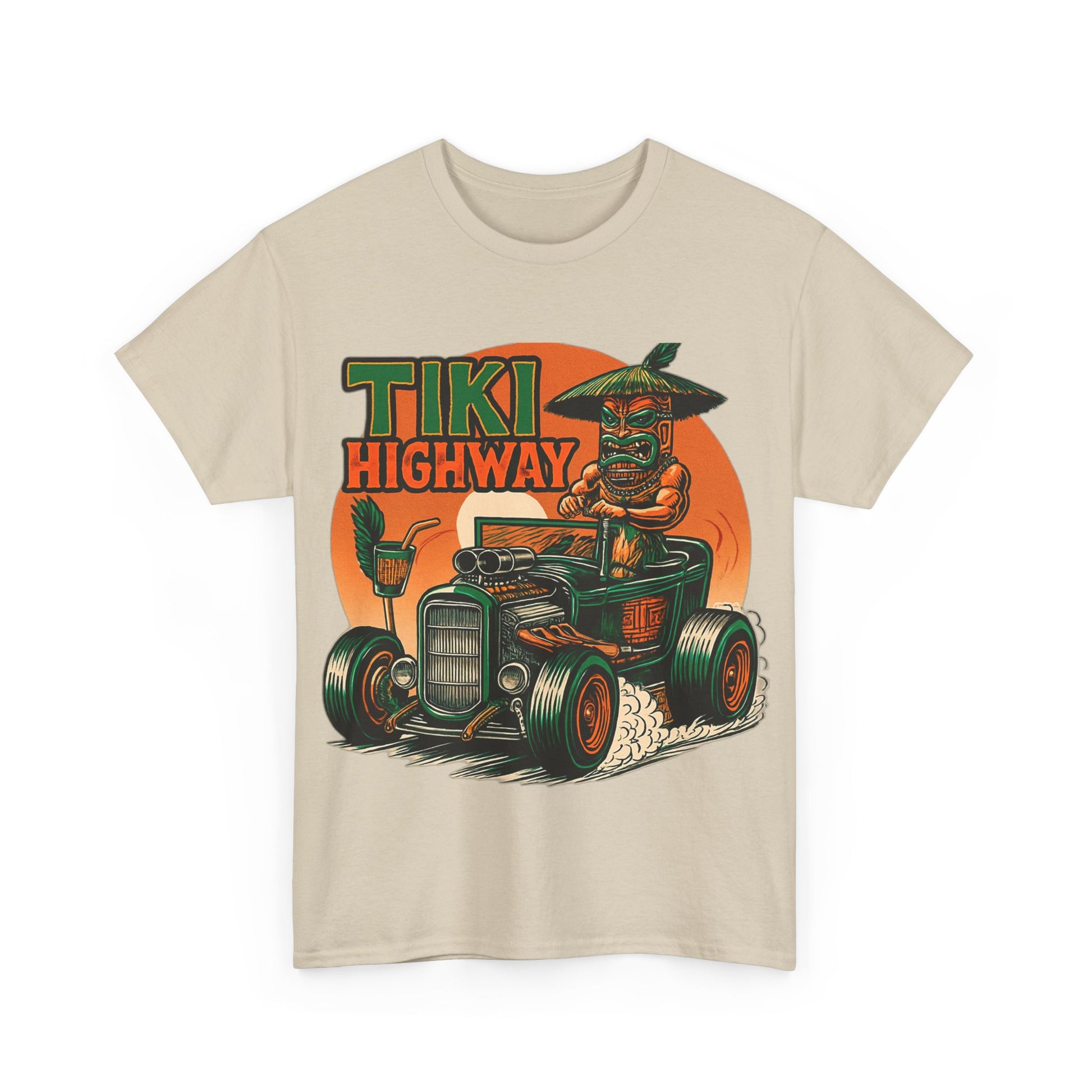 Retro Tiki Highway T-shirt featuring a cool Tiki driving a ratrod hitting the open road. This vintage-inspired tee exudes a laid-back, fun-loving vibe perfect for casual outings and summer adventures. Ideal for retro enthusiasts, Tiki culture fans, and anyone looking to add a quirky touch to their wardrobe. Great for beach parties, summer vacations, and road trip enthusiasts.
