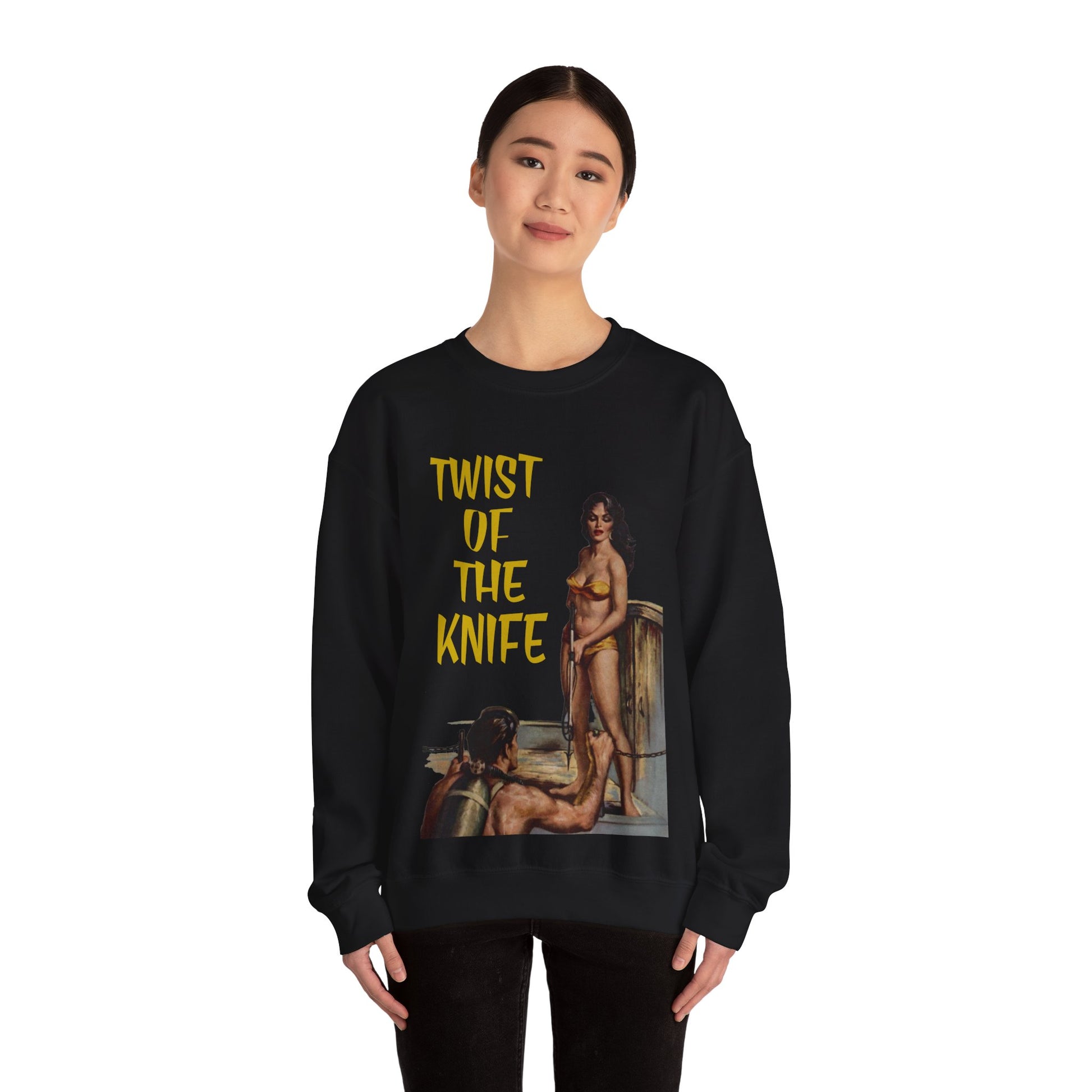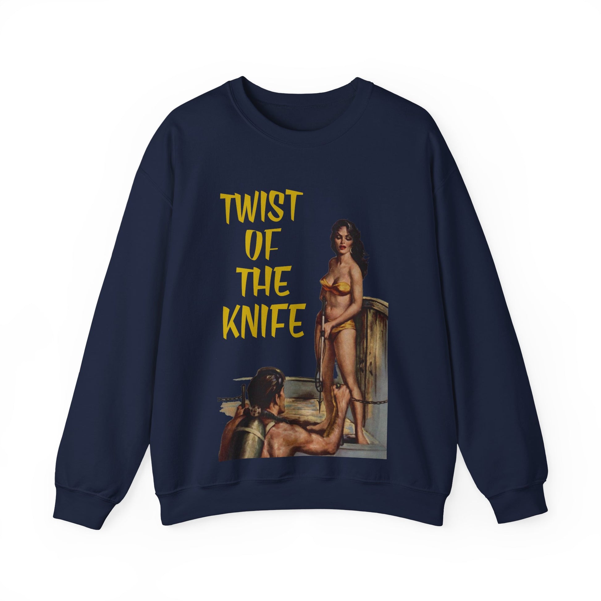 This Twist Of The Knife Hooded Sweatshirt features a sexy 60s bikini clad beauty holding up an unsuspecting scuba diver as he emerges from the water, using a speargun.