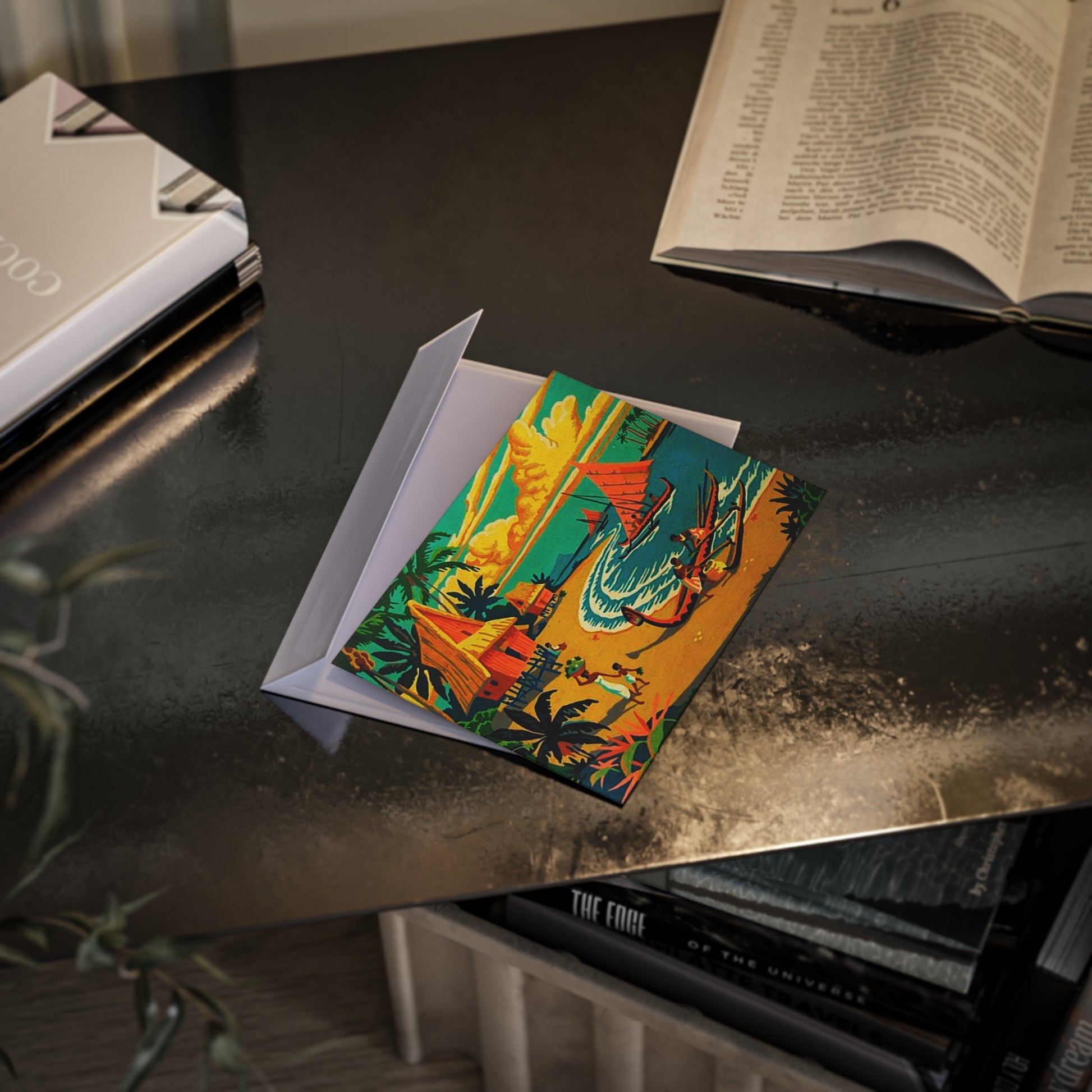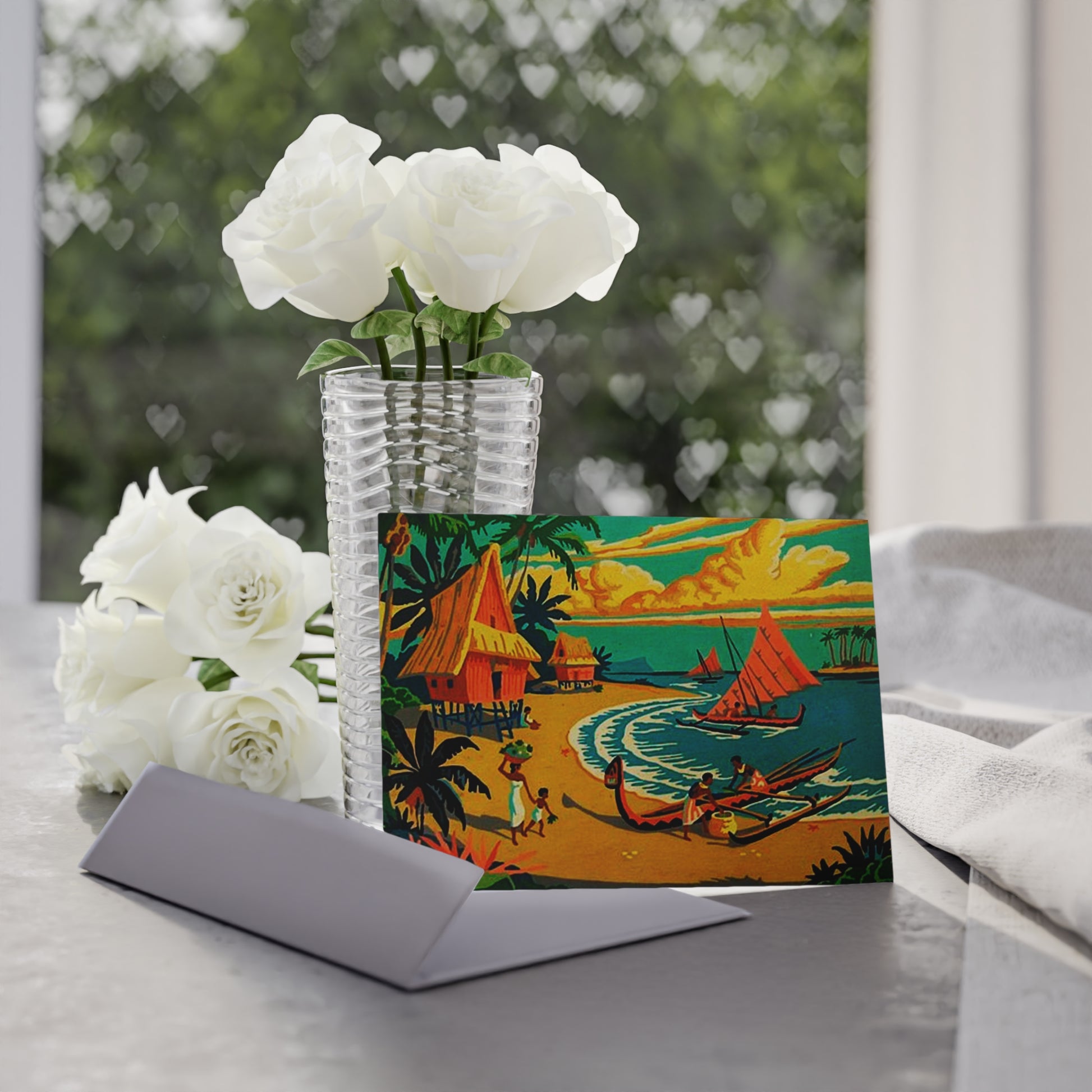 These vintage island scene greeting cards feature a vibrant beach scene on eco-friendly stationery. Perfect for sending holiday greetings or any occasion to friends and family. The one-sided print adds a unique touch to your message.